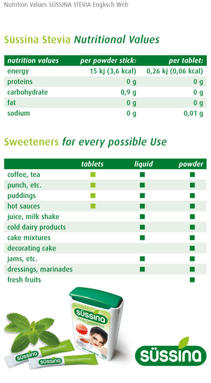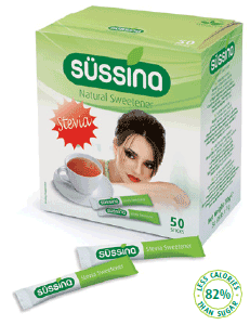 Süssina Stevia powder sticks of 1g provide quality sweetening with 82% less calories than sugar! Süssina Stevia sticks are free of sugar alcohols in their recipe |