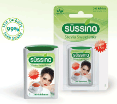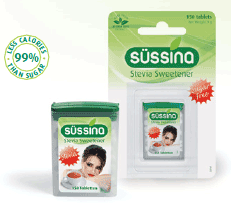 | Süssina Stevia tablets in a flip box of 150 units and a dispenser of 200 tablets. The tablets contain 0,06 kcal per unit and are therefore virtually calorie-free. |